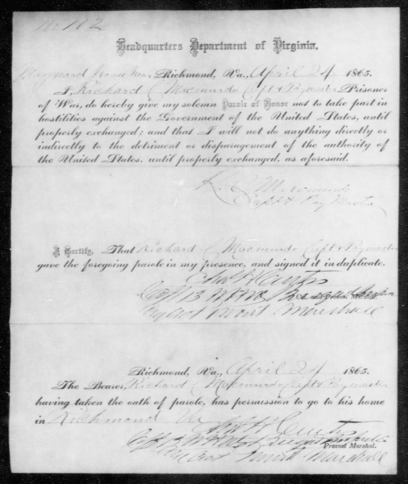 Now hit real paydirt on Footnote.com–over 100 pages of his service records. A two-page letter he wrote on December 13, 1861, early in the Civil War, to Major General Leonidis Polk (“The Fighting Bishop”), apparently a friend of the family, explaining that he was a private who was seek promotion to officer. A report from the Confederate States of America Treasury Department of payment of $250 to Macmurdo for his horse (Confederate officers typically supplied their own mounts) that was killed at the Battle of Fredericksburg. But, it took a year to for Macmurdo to collect this payment, and only after he hired a lawyer to pursue his claim! More documents told the story of how, in August, 1863, Macmurdo was given command of the Confederate Ambulance Shops in Richmond, Virginia. His office was on the docks along the James River, just opposite the notorious Libby Prison, where many Union officers suffered and died. Macmurdo reported that in 1864 his men built 264 ambulances. However, they lost almost a month of work time because the dock was flooded by the cresting river. Finally, on April 24, 1865, Captain Richard C. Macmurdo signed a “Parole of Honor” “not to take part in hostilities against the Government of the United States.” The War of the Rebellion was over for Captain Macmurdo. Here’s the oath of allegiance to the United States of America thathe signed at the end of the Civil War.