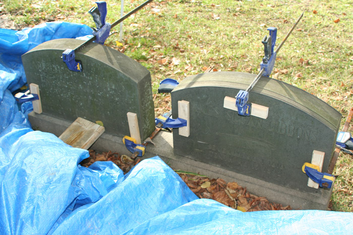 UPDATE: December 4, 2009: A very exciting update. Last week I went out to the lot at Green-Wood where these individuals are interred to check whether Scipio Franks and Margaret Franks have a gravestone. There it was, right in the front of the lot. And, interestingly, it matched several of the other gravestones in the lot–a nice touch. But I did notice that the stone on which their names were carved was a bit askew–it had separated from its base. [Update on the Update: I didn’t put a photograph of the Franks’s gravestone up in the original update because I was concerned, when it was unattached, that someone might take it. However, now that it is securely re-attached to its base, here it is]. I also noticed that two gravestones in the lot had been heaved by the roots of a large tree, and were also off kilter. And, walking to the back of the lot, I saw that the gravestones for Abigail Hopper Gibbons and James Sloan Gibbons had delaminated: the slate stone, about 4 inches thick, had come apart, and the inscribed faces of each of their gravestones, on which the carving had been done, were propped up against the stone that was still attached to the base. Now, Green-Wood Cemetery is a remarkable place. I sent an e-mail to Frank Morelli detailing these problems and asking him to see what he could do. Well, just one week later, I went back out yesterday, and Frank and his Restoration Team had already done their magic. The Franks’ gravestone has been re-attached to its base, the two stones tilted by the tree roots have been leveled, and the two gravestones that had come apart have been put back together. Here’s a view of the repair, waiting for the adhesive to dry. This kind of coordination and work makes you proud to work at Green-Wood Cemetery. Great thanks to Frank and his crew!