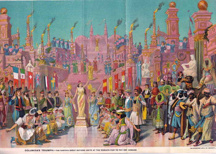 I’ve recently purchased several booklets about Kiralfy’s productions for the Green-Wood Historic Fund’s Collections. Here’s a great image from the booklet about his “Grand Historical Spectacle” America, performed at the Chicago Auditorium “in four acts and seventeen scenes,” in 1893.