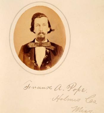 So, I picked up the form for a Frank A. Pope, who died in 1880 at the age of 40. Most interestingly, his birthplace was listed as Mississippi. A Confederate, perhaps? Well, I checked a database of Confederates; 6 men named Frank Pope had served the Confederacy, but only 2 with the middle initial of A, and only one from Mississippi. So I went on Footnote, the subscription website of the National Archives, and found the military records of the Frank A. Pope who had served in the 29th Mississippi Infantry as a first lieutenant. Pope had enlisted in 1862, was captured at Lookout Mountain, Tennessee, on November 24, 1863, by men under the command of Major General George Thomas (who had one of the great Civil War nicknames, “The Rock of Chickamauga”) and was held as a prisoner of war on Johnson’s Island, Michigan, until June 13, 1865, when he signed an oath of allegiance to the United States and was released from custody. An interesting story. But was he the Frank A. Pope interred at Green-Wood Cemetery? I needed an age for the soldier. And there it was: the Frank A. Pope had given his oath of allegiance at the age of 26. That means he was likely born in 1838. And the Frank A. Pope interred at Green-Wood was likely born in 1839. Close enough, given that both the soldier and the interee had a link to Mississippi, and the rarity of the name, to be a match. Now I googled him, looking for anything else that might pop up on the Internet. And look what I found! There it is, above, a photograph from the yearbook of the University of Mississippi, class of 1861, of a Frank A. Pope. The age looks right–the man interred at Green-Wood, the Confederate lieutenant, would have been about 22 or so here. And, amazingly, look at the notation below his name: Holmes County, Mississippi. So where do you think First Lieutenant Frank A. Pope enlisted on March 15, 1862? It was Lexington, Mississippi, which, a little research reveals, is the county seat of Holmes County, Mississippi. I think that’s our man, looking back at us after all these years!