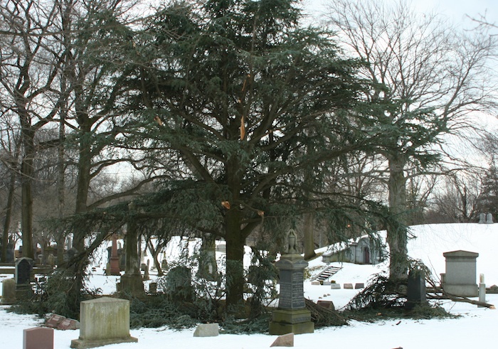 The recents storms that swept through Brooklyn, with strong winds and wet snow, were not kind to Green-Wood Cemetery’s trees. Heavy snow and wind are never a good thing for trees. While it looks like no trees were uprooted by these forces, many (perhaps a hundred or so, by the estimate of our Superintendent of the Grounds, Art Presson) were damaged, most by having limbs snapped off. The beech tree pictured above was particularly hard hit–you can see the large section of this wonderful tree that has split off and fallen to the right. Because of the split along the trunk, this tree is likely a total loss.