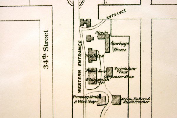 The map's lower right hand corner, showing the work yard off Fourth Avenue near 34th Street. Note the blacksmith shop, the scrimshaw plant (the paving system in use at the time), the stone crusher, and more.