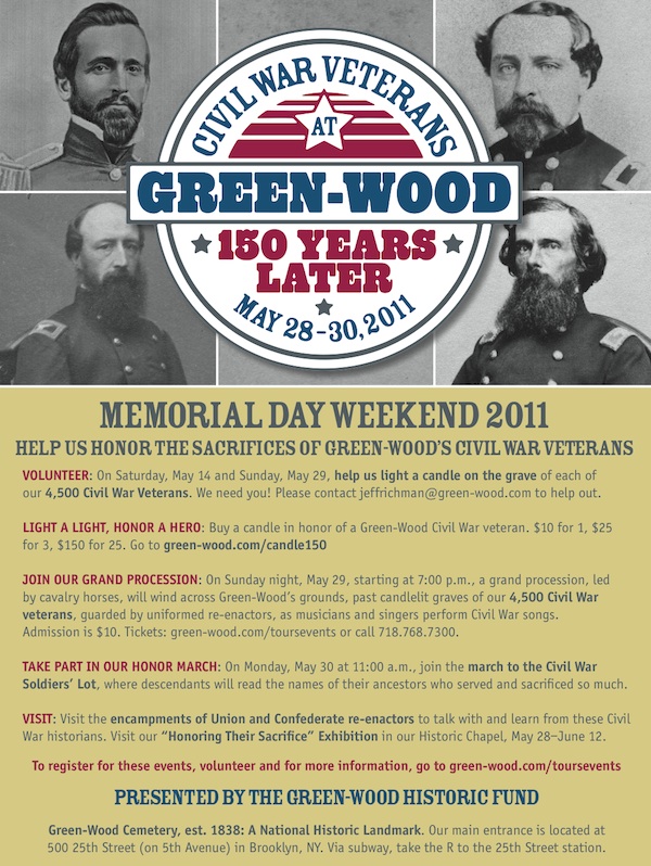 Please click on the links and bold text in the flier below for more information about each event listed. Click here for additional background on the Civil War Sesquicentennial at Green-Wood. Those interested in our compilation CD of Green-Wood Civil War veteran biographies, as mentioned in recent Associated Press coverage, should click here to purchase the CD from our store for $10.