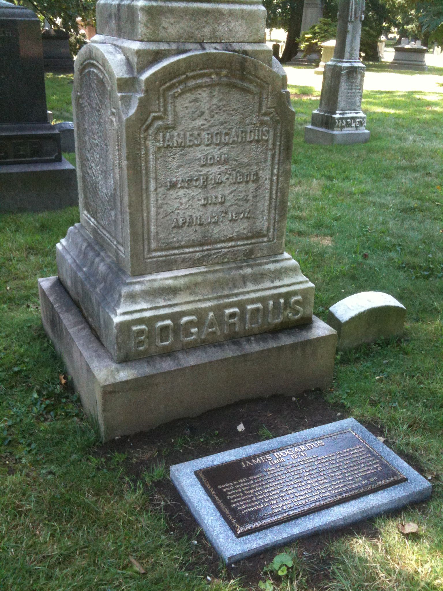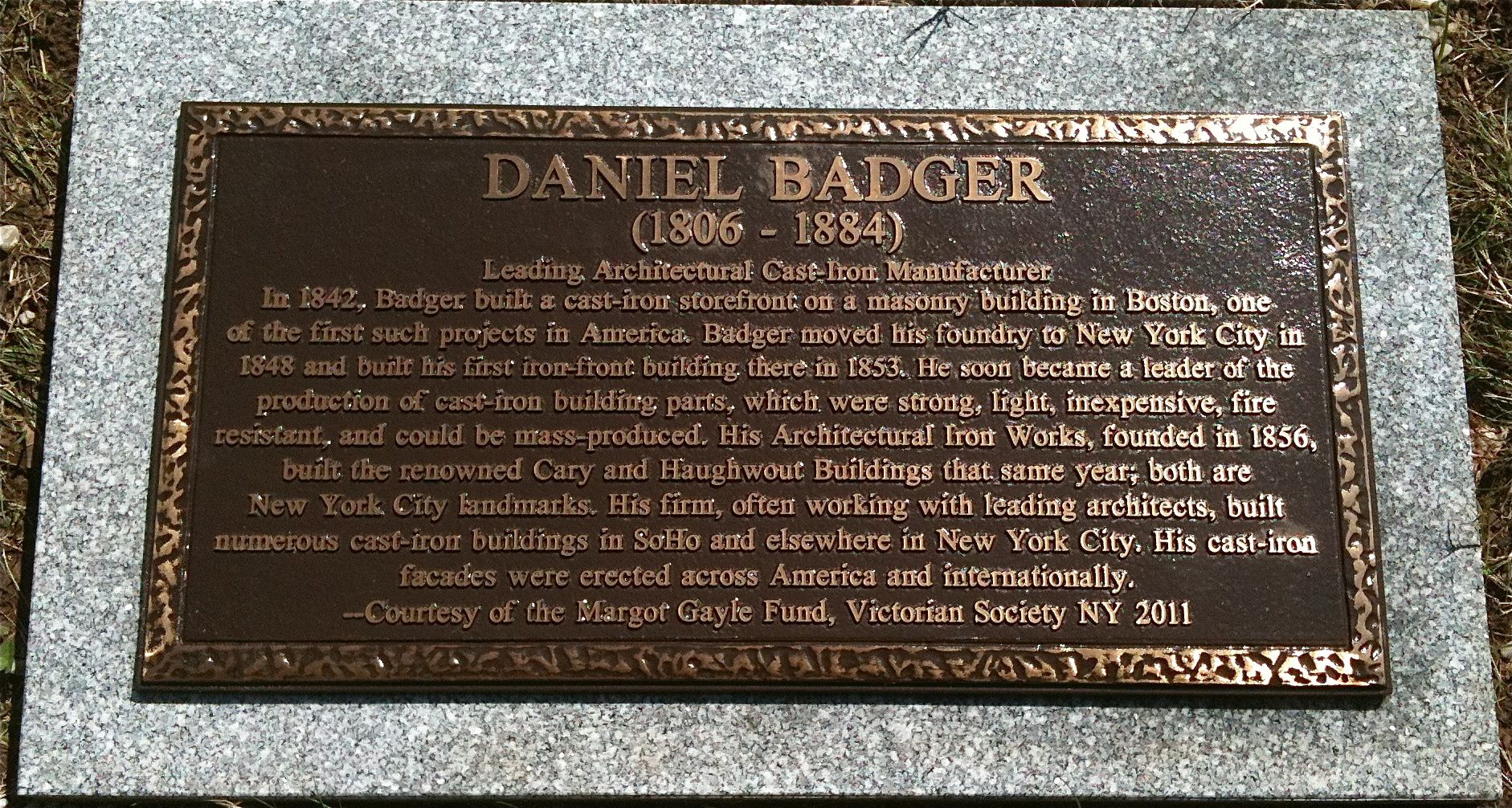 However, not until weeks ago were their respective accomplishments detailed at their gravesites. With funding from the Margot Gayle Fund of the Victorian Society of New York (thanks!), Bogardus and Badger now have handsome bronze plaques, mounted on granite bases, that describe their great contributions.