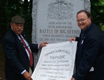 The new monument behind us is the only one raised to the Union heroes of Great Bethel – there are three Confederate monuments on the field, all placed there about a hundred years ago. The ceremony included the dedication of the new Union monument, and a rededication of the one from North Carolina. There were about 100 people present for these dedications, including the descendant of the only Confederate killed there, Private Henry Lawson Wyatt (North Carolina gave Wyatt his own monument). Jeanne Vincens and her sister, along with me, represented descendants of Duryee’s Zouaves who were killed there. A few dozen reenactors of the 5th NY Inf, 1st Vermont Inf, a Confederate color guard, and a section of the battery of the Hampton Blues with two cannon all fired salutes. The Daughters of the Confederacy were also out in force, along with some local dignitaries, and lots of CW buffs. I presented John Quarstein with the Taylor rubbing, and everyone wanted to get a picture of it! Flags waved, drums beat, a bugle blew Taps. A very moving ceremony, I must say.