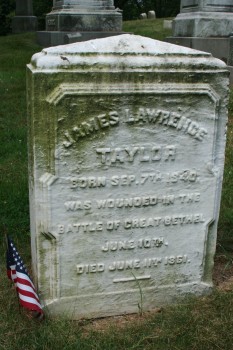 native of London, England, who worked at the prominent Broadway jewelry firm of Ball, Black & Company, then enlisted at New York City on April 25, 1861, and mustered in on May 9. He was wounded in the chest at Big Bethel and died of his wounds on June 24, 1861, at Fortress Monroe, Virginia. His brother went there and retrieved his remains. He was interred at Green-Wood on June 26 in section B, lot 9895, grave 757. James Taylor (1840-1861) enlisted on May 9, 1861, mustering into Company B of the 5th New York. He was wounded in the groin at Big Bethel (possibly from “friendly fire”), and died the next day (though some records list him as “killed in battle” on June 10). He was buried at Green-Wood on May 31, 1865 in section 11, lot 2524.