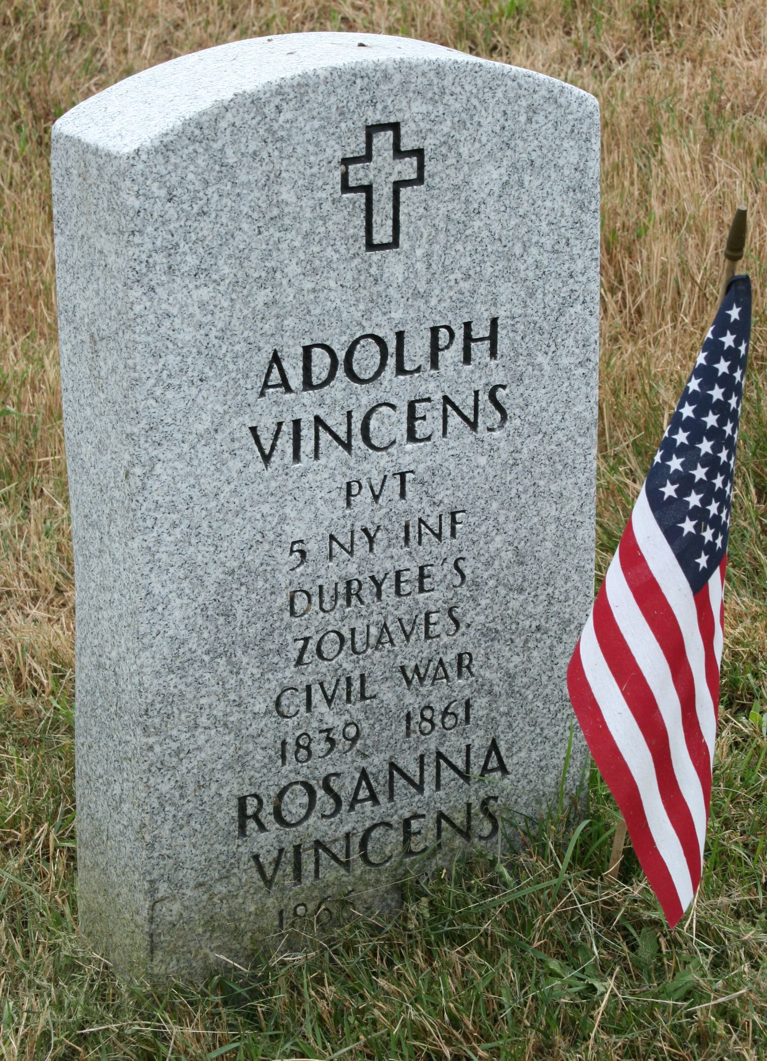 Two of those Union dead, Privates James Taylor and Adolph Vincens, both serving with the Fifth New York, are interred at Green-Wood. Vincens (1839-1861) was a