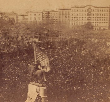 The next day, April 20, a massive meeting was held in Union Square. The crowd, estimated at 100,000, the largest that had ever gathered in the history of the nation until then, roared its approval as several of the heroic soldiers who had garrisoned Fort Sumter were introduced and patriotic speeches were made. Though sentiment was far from unanimous, the movement towards war with the secessionist states gained momentum. Here’s the New York Times’ lead for its story the next day, dramatically headlined “THE UNION FOREVER!; Immense Demonstration in this City. THE ENTIRE POPULATION IN THE STREETS:”