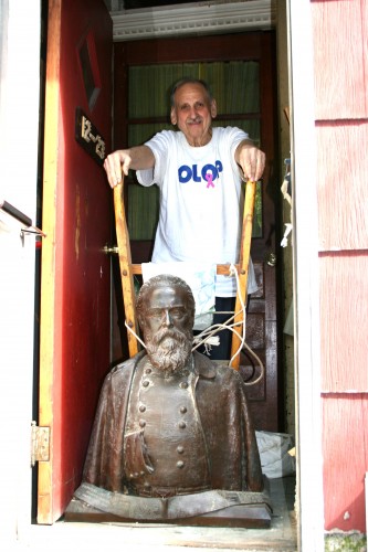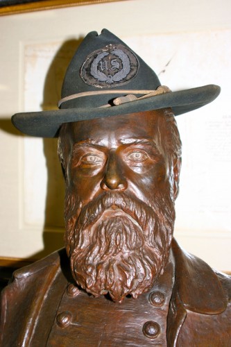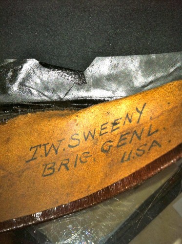 And, just in the last few weeks, we’ve added another great Sweeny piece to our collections. We bought this hat–the one that he wore on special occasions after the Civil War–Grand Army of the Republic events and such. In the photograph below, we have united the bronze bust of Sweeny with his hat: