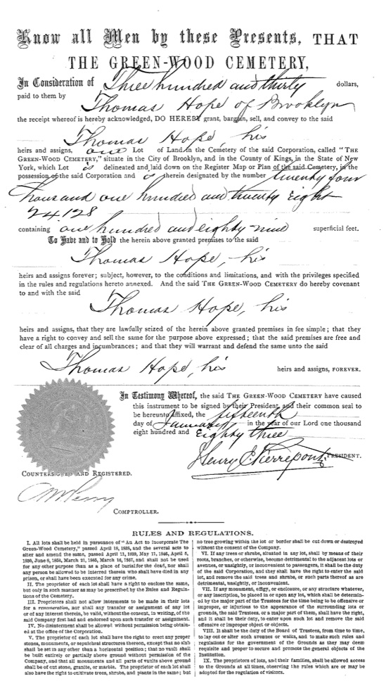 On January 15, 1883 (just slightly more than four months before the Brooklyn Bridge opened), Thomas Hope paid $330 for lot 24128. It was a medium-sized lot, with a border of 189 feet. And the deed routinely included on it printed Rules and Regulations–Green-Wood was taking no chances that a lot owner might go with the “I had no idea” defense to any rules violations. The rules state that “all lots . . . shall not be used for any other purpose than a place of burial for the dead” (no picnics, etc.), that no person “who shall have died in any prison, or shall have been executed for any crime” would be allowed to be interred (not to worry–this rule was regularly waived by cemetery officials), that “proprietors shall not allow interments to be made in their lots for a remuneration” (no selling off a grave here and a grave there), “all monuments and all parts of vaults above ground shall be of cut stone, granite, or marble” (no veneers, no brick), no tree in a lot was to be cut down without cemetery permission, and if a majority of the trustees determined that any monument, enclosure, or structure was “offensive or improper, or injurious to the appearance of the surrounding lots” it shall be removed. Before there was zoning out in the world, Green-Wood had substantial rules and regulations to control what was done on its grounds.