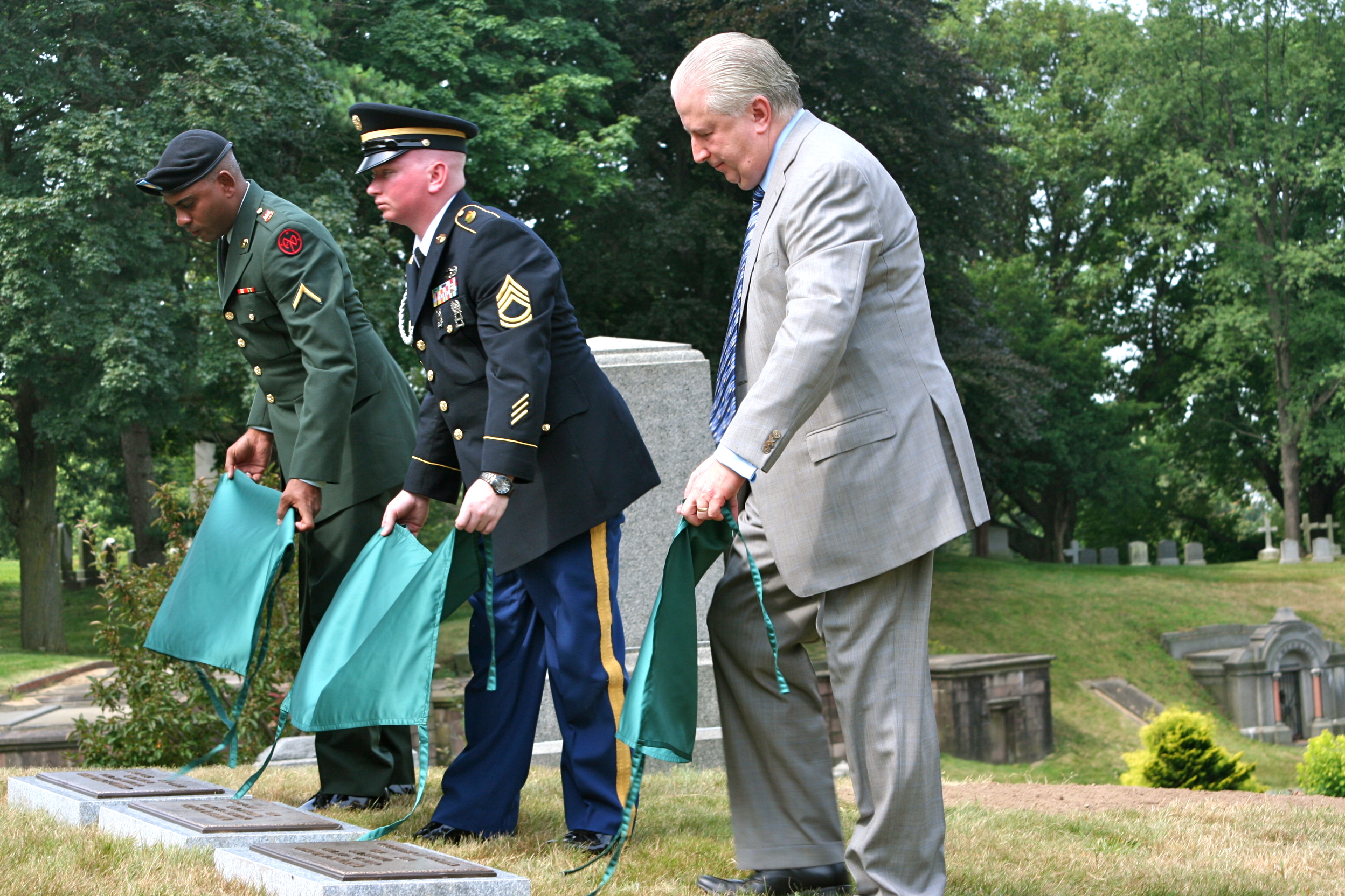 This past Friday, July 13, a ceremony 164 years in the making occurred. We honored men who served the United States of America and sacrificed their lives all those years ago. They were interred at Green-Wood on July 13, 1848, but their graves were never marked. Now each has a bronze plaque, mounted on a granite base, marking his final resting place. Here’s the story, as reported by The New York Times. For the background on this story, please check these earlier blog posts here, here and here.