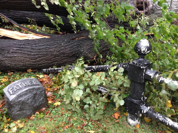 This old Cherry tree was blown over, landing on a mausoleum.This Norway Maple splintered in several directions, knocking down part of the iron fence near Green-Wood's Fort Hamilton Parkway entrance.