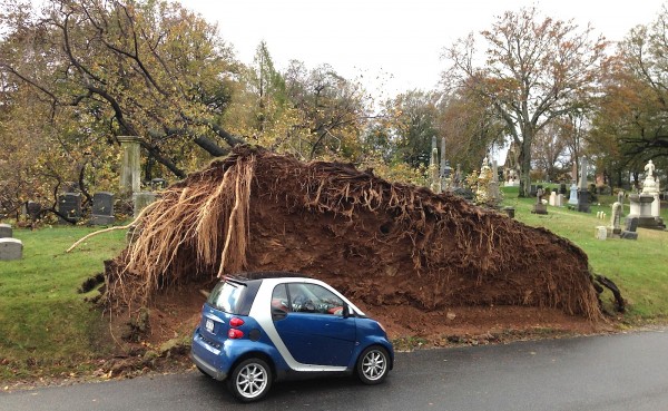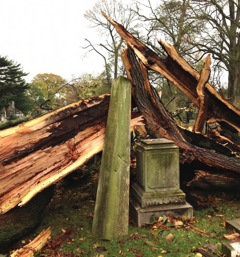 With 7,000 trees, Green-Wood was quite an attractive target for Hurricane Sandy. And Sandy, with her big winds, was not kind. In all, 150 of Green-Wood’s trees were destroyed. And, just days after the storm, we estimate that well in excess of 100 monuments were damaged–that toll may go higher as trees are removed and more damage is uncovered.