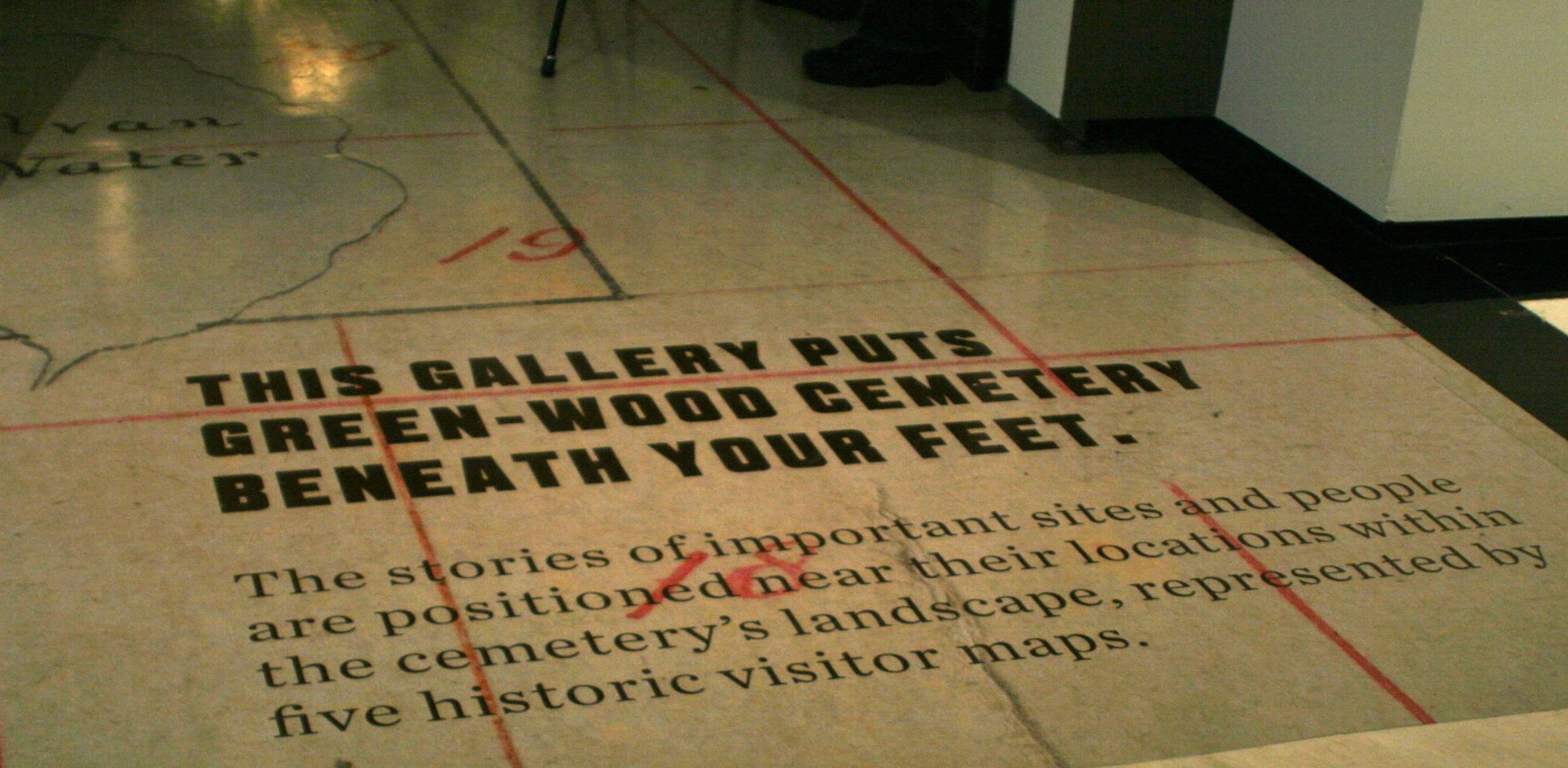 Because of the brilliant design of Abbott Miller of Pentagram, visitors the the Museum will be able to step into Green-Wood–the floor of the exhibition space has been printed with maps of the landmark cemetery.