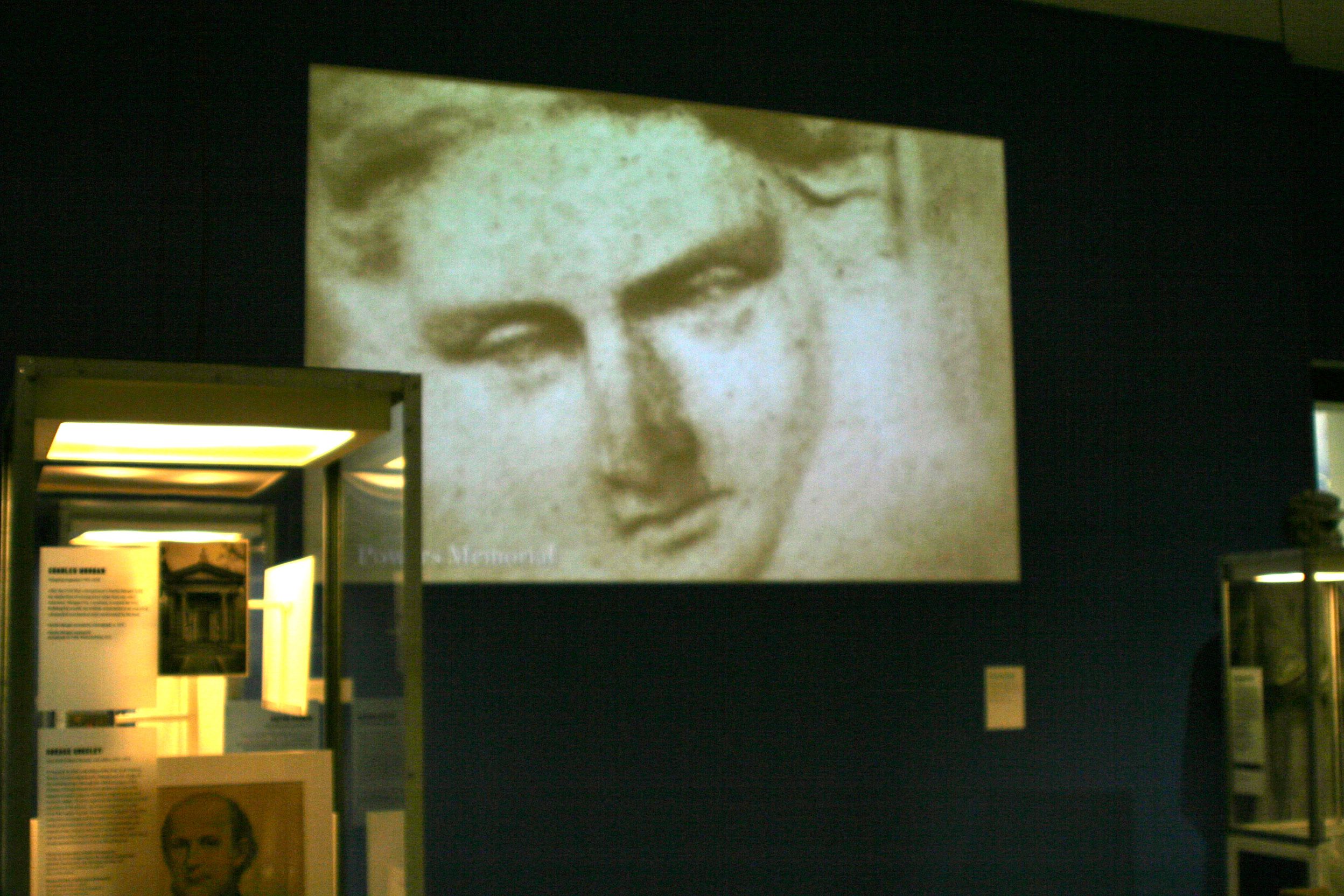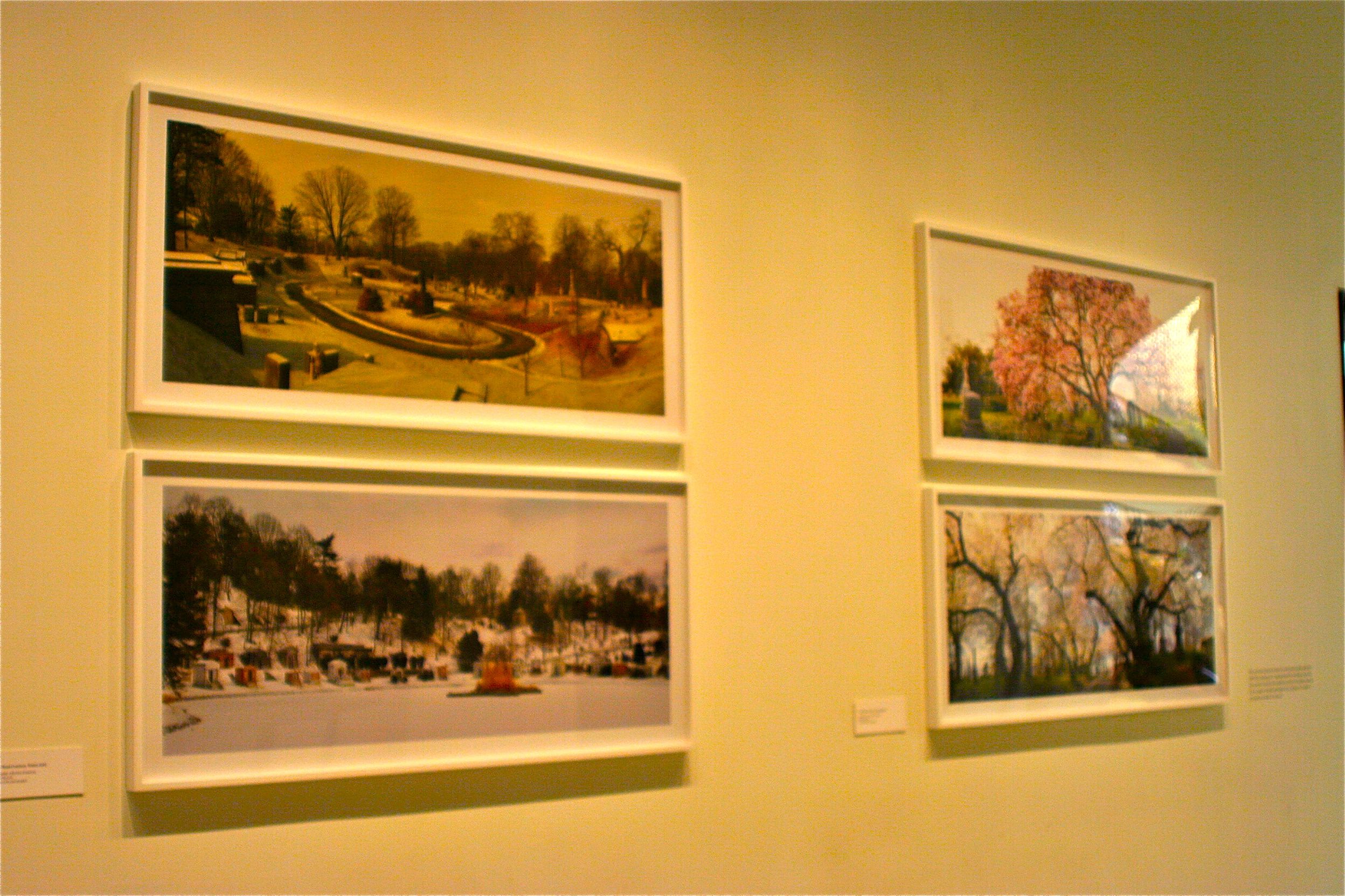Inside the exhibition gallery, a slide show of sepia photographs of Green-Wood monuments and mausoleums by Colin Winterbottom of Washington, D.C., is projected onto a gallery wall: