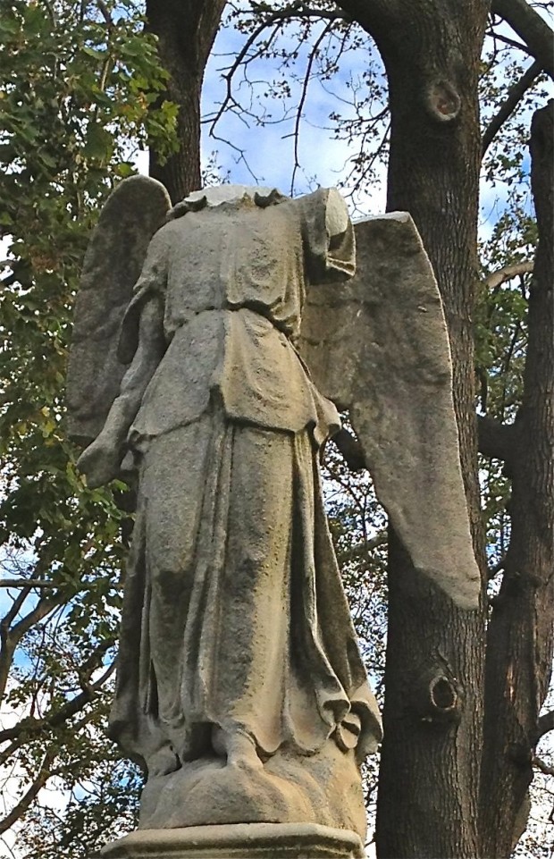 Near the Beard Bear, a large branch, snapped by Sandy’s roaring winds, fell off of a Norway Maple, taking off the head and arm of the Lloyd Angel.