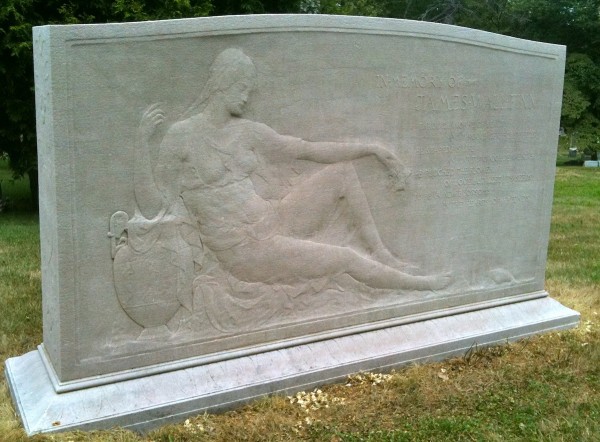 MacMonnies (1863-1937) was supposed to be interred at Green-Wood in his family’s lot there. On the morning of his funeral, his grave there already had been dug. But, just before the funeral cortege was to arrive, his wife called and cancelled his burial at Green-Wood. He was interred elsewhere and now sadly lies in an unmarked grave. But two of MacMonnies’s great sculptures adorn Green-Wood. This is the monument he sculpted, in low relief, for his friend and fellow artist, James Wall Finn, who was a muralist for Tiffany Studios: