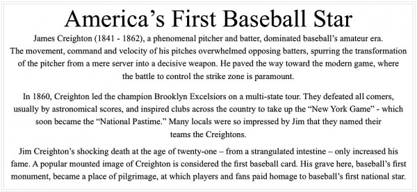 Tuesday, April 15, was a rainy and windy day. Winter trying to slide back in for a final run. It was a good day to finish up your taxes. But it was an even better day to honor America’s first baseball hero, James Creighton. It was Jim’s 173rd birthday.
