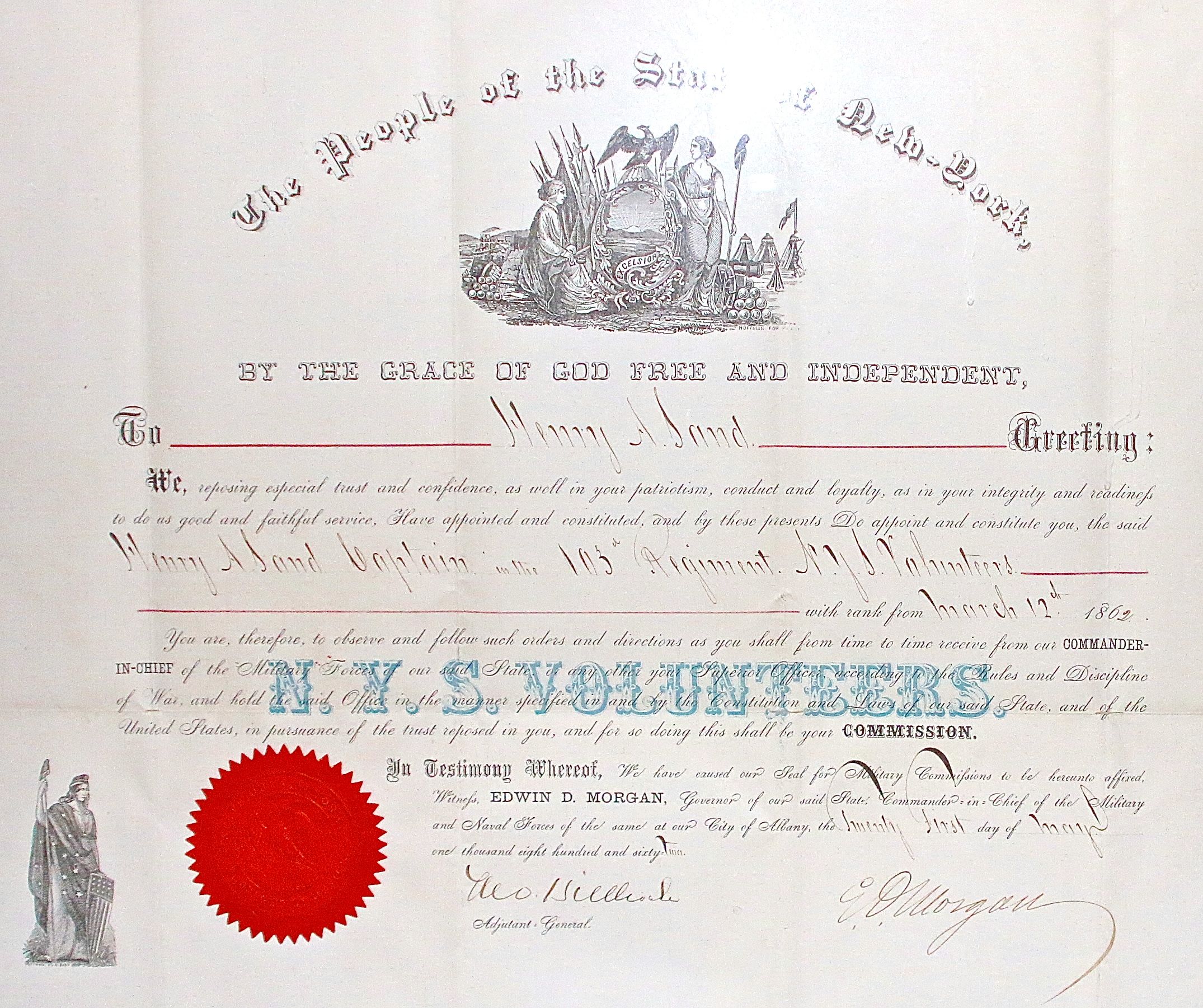 Captain Henry A. Sand’s commission in the 103rd New York State Volunteer Infantry, issued in 1862 and signed by the governor.