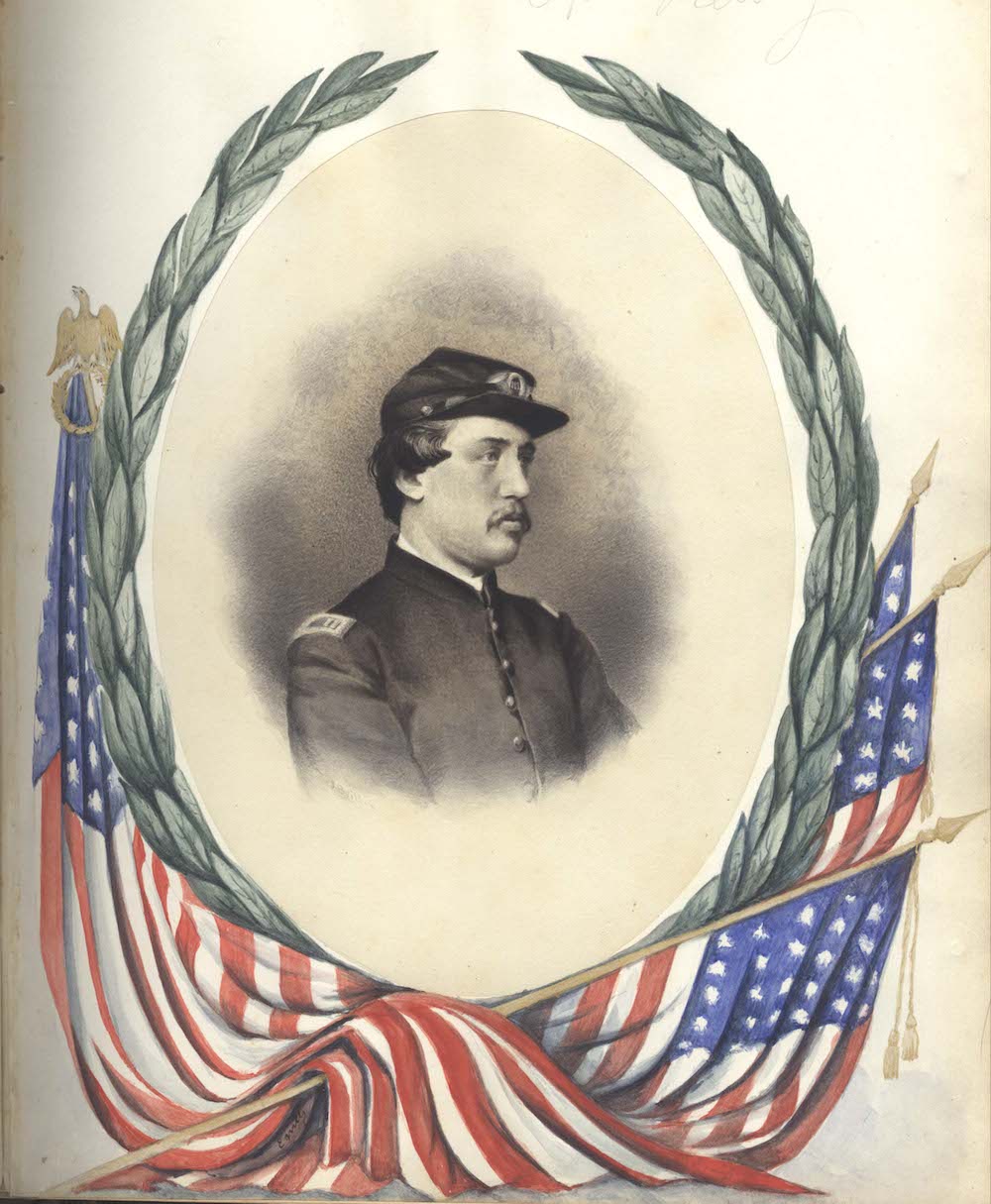 This drawing of Henry, framed by the laurel wreath of a hero, was drawn by his sister, Emily, in a memorial book she created after Henry succumbed to his battle wound.