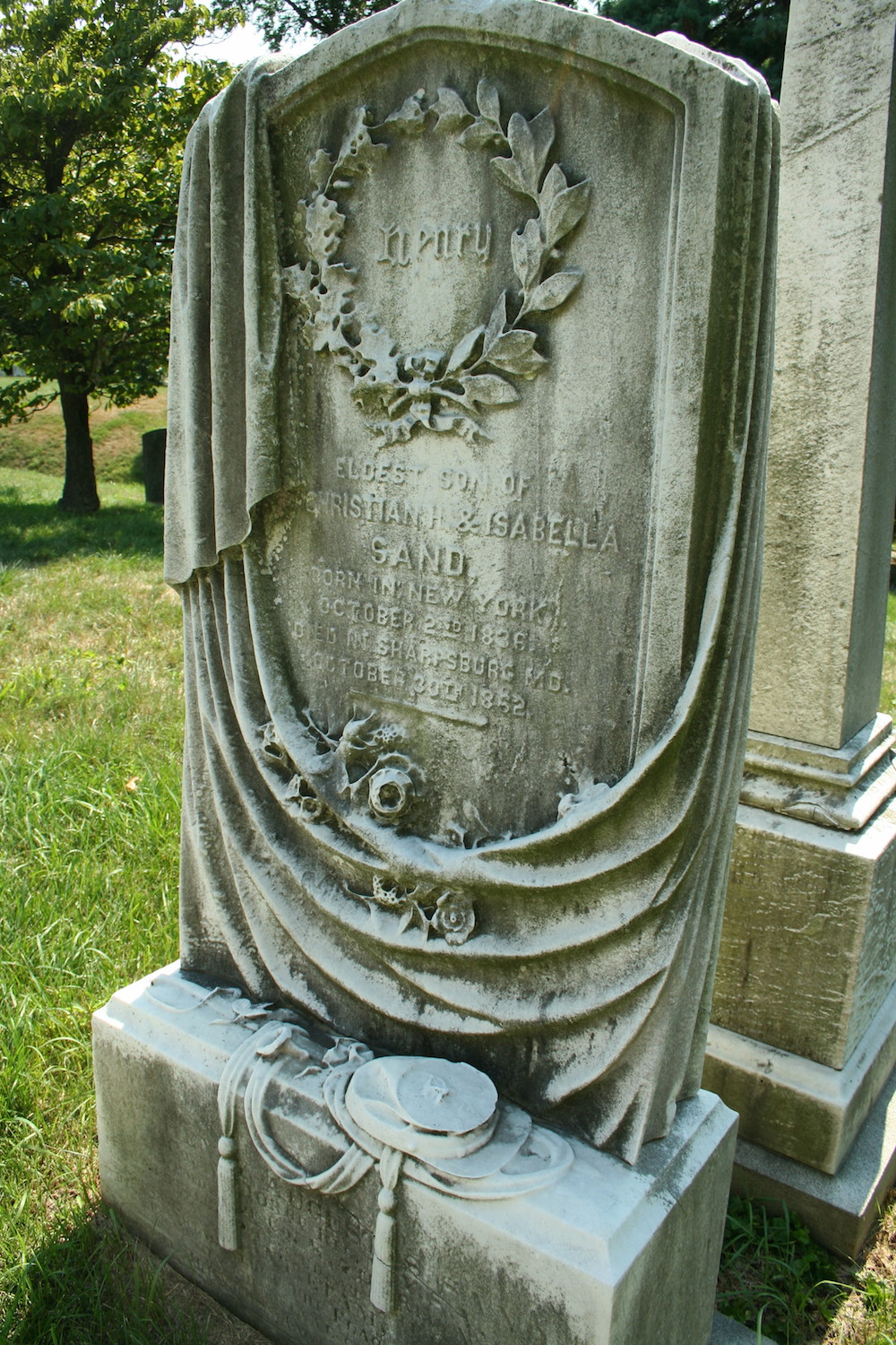 I feel like I know Henry Augustus Sand pretty well. Not that I ever met him. After all, he died in 1862. But, I have read a great deal about him, his service to his country, and his ultimate sacrifice. He is, of course, interred at Green-Wood. I told his noble, heroic, yet sad story at length in my book, Final Camping Ground: Civil War Veterans at Brooklyn’s Green-Wood Cemetery, In Their Own Words. His descendants were wonderfully cooperative in doing that–they shared his letters, those of other members of his family, and an extraordinary memorial book that his sister put together, featuring her own 1863 paintings of the Antietam battlefield where he was mortally wounded, the barn to which his shattered body was carried, and the Otto Farmhouse, where he struggled to live, but ultimately died.