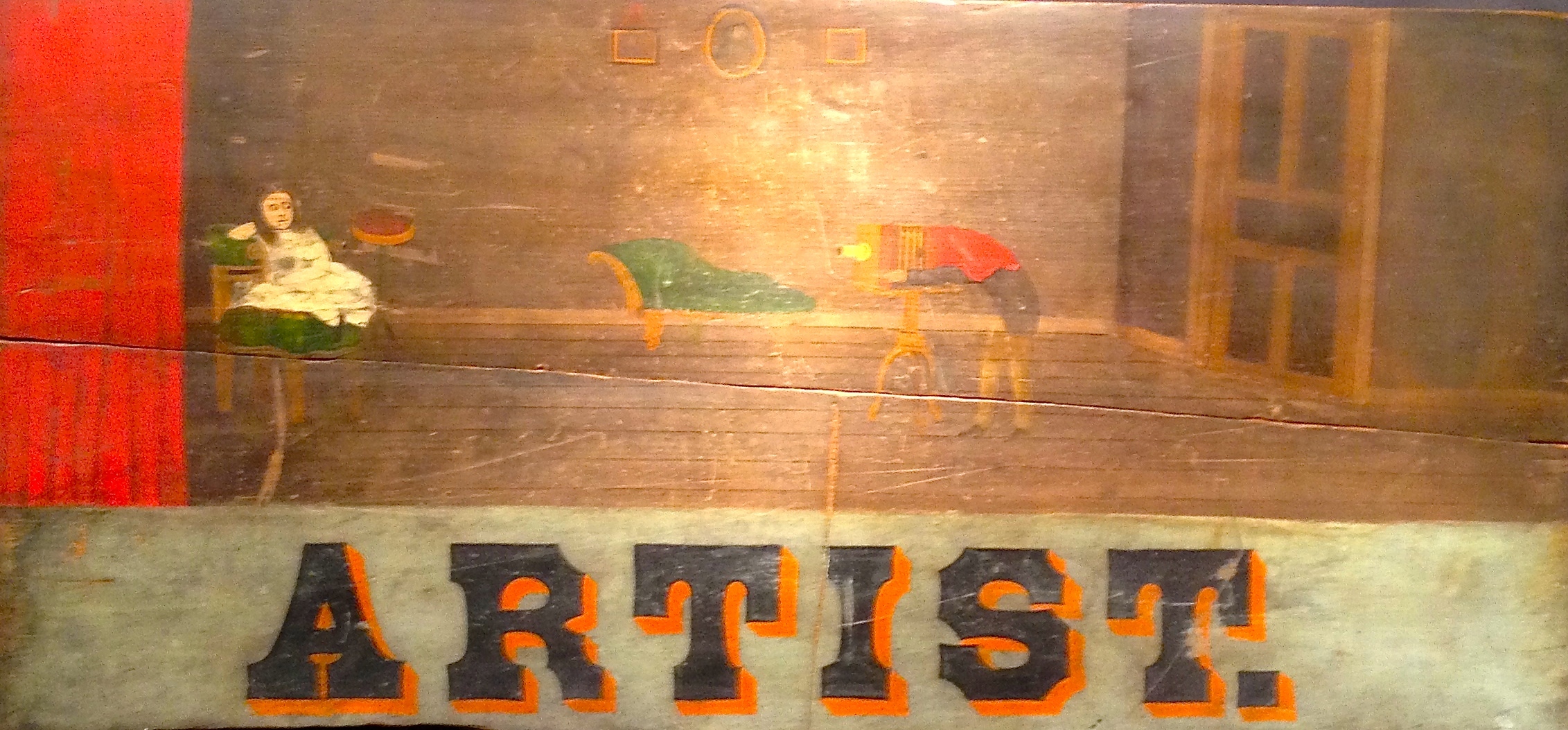 A 19th-century sign painted on wood, advertising the business of an Indiana “artist.”