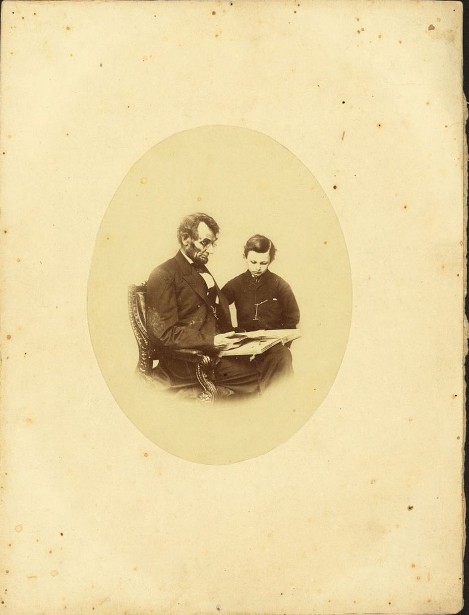 This photograph of Lincoln and his son Tad was taken by Anthony Berger on February 9, 1864, at Brady’s National Photographic Portrait Galleries. It is one of the most popular portraits of Lincoln and the only one showing him wearing glasses. National Portrait Gallery.