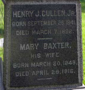 When the Brooklyn Daily Eagle reported his death on March 13, 1892, it noted that he had been a powerful financial figure. At the time of his death, Cullen was director of the People’s Trust Company, the Brooklyn Heights Railroad Company, and the New York and New Jersey Telephone Companies. The article in the Brooklyn Daily Eagle stated that he had previously been interested in gas and was a founder of the Metropolitan Company. His last address was 23 Pierrepont Street in Brooklyn. His death was officially attributed to blood poisoning. He was survived by his widow, Mary Baxter Cullen. His funeral took place at Grace Church in Brooklyn; among the pall bearers were David A. Boody, the mayor of Brooklyn, and Hugh McLaughlin, the aforementioned Democratic Party “boss.” The Times reported that his brother, Edgar, denied a motion to adjourn proceedings of the Supreme Court out of respect to Henry’s passing, noting that “the work of the court was too pressing to be delayed.” Section 185, lot 23699.