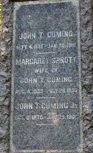 A document from the Record and Pension Office of the War Department dated July 31, 1903, verifies that pursuant to an Act of Congress approved on February 24, 1897, Cuming held the rank of first lieutenant as of August 18, 1862. In 1907, his application for a pension was granted, certificate 1,137,705. A resident of Manhattan, he lived at 134 East 93rd Street at the time of his death. A widower, his wife, Margaret Sprott Cuming, died in 1895, and a son, who bore his name, died in 1900 at age twenty-five; he was survived by two daughters. Section 169, lot 15851.