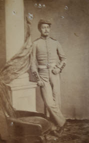CUVILLIER, LEON (or LOUIS, L.L.) (1832-1866). Captain, 38th New York Infantry, Company I; first lieutenant and adjutant, 55th New York Infantry; private, 7th Regiment, New York State Militia, Company F. Originally from France, Cuvillier first served in the 7th Regiment for 30 days in 1861. He then re-enlisted at Staten Island as an adjutant on August 26, 1861, and was commissioned two days later into the Field and Staff of the 55th New York with a promotion to first lieutenant and adjutant. On May 31, 1862, he was wounded at Fair Oaks, Virginia. An article in the New York Herald on June 8, 1862, notes that soldiers were brought to Boston on the Daniel Webster, a hospital ship of the Sanitary Commission, and would return to their regiments after treatment. Cuvillier was among those treated; he was wounded twice in the left arm and once in the side, and was in “comfortable” condition. On December 23, 1862, he transferred into the Field and Staff of the 38th New York as an adjutant, upon consolidation of units. His promotion to captain on February 19, 1863, became effective upon his transfer to Company I on April 3. He mustered out on June 22, 1863, at East New York. He last resided at 258 South 6th Street in Jersey City, New Jersey. His death was attributed to consumption. In 1880, his wife’s application for a widow’s pension was granted, certificate 237,801. A minor’s pension was also granted at that time, certificate 238,725. Section 115, lot 4196, grave 63.