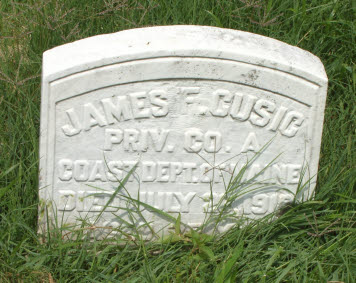 Remaining interested in military affairs, Cusic was active in the Abel Smith Post #435 of the G.A.R. The 1882-1883 Brooklyn Directory identifies him as a painter; during those years, he lived at 11 Fleet Place. In 1892, he applied for and was granted an invalid pension, certificate 948,483. According to the censuses of 1900 and 1910, he was living in Brooklyn where he was a laborer at the Navy Yard. Cusic’s obituary in the Brooklyn Standard Union confirms his Civil War service. His last residence was 1450 36th Street in Brooklyn. He died from pneumonia. In 1918, Henrietta Cusic, who is interred with him, applied for and received a widow’s pension, certificate 864,970. In addition to his widow, he was survived by two daughters and four sons. Section 166, lot 25685.