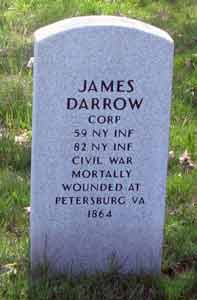 DARROW, JAMES C. (1824-1864). Corporal, 82nd New York Infantry, Companies K and E; 59th New York Infantry, Company I. After enlisting as a private at New York City on December 9, 1863, he mustered immediately into the 82nd New York. According to the muster roll, he listed his occupation as soldier, and was 5′ 10¼” tall with hazel eyes, brown hair and a sandy complexion. Darrow was promoted to corporal on March 1, 1864, and transferred to Company E on May 24. Shortly after he was wounded at the Battle of Petersburg, Virginia, on June 24, 1864, he was transferred to the 59th New York on July 10. On November 10, 1864, he was severely wounded in the leg at Petersburg, had the leg amputated, and died from his wounds on November 20. The burial at Green-Wood was on January 15, 1865.