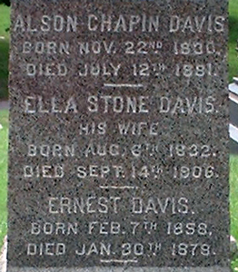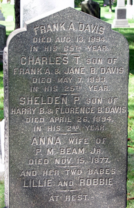 A carriage manufacturer by trade, he had a factory on Henry Street in Brooklyn for fifty years. The 1873-1876 and 1890-1892 Brooklyn Directories lists him as a carriage builder at 18 Henry Street; during those years, he lived at 84 Poplar Street. His last address was 84 Poplar Street in Brooklyn. Davis died of apoplexy. Section 138, lot 26048.
