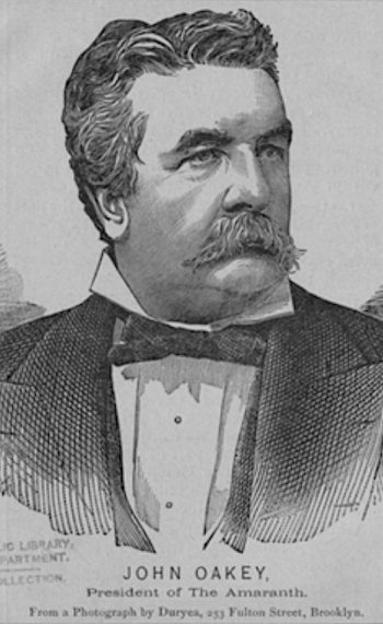 According to his obituary in The New York Times, which confirms his Civil War service, Oakey was a popular stump speaker and lecturer who was active in civic life. He was a member of the Mansfield Post #35 of the G.A.R., the Society of Old Brooklynites, and the Brooklyn and Atlantic Yacht Clubs. He also belonged to the Lincoln Club, the Yale Alumni Association of Long Island, and was a founder of the Entre Nous, the Social Literary Union and the Athenian Society. One organization to which he belonged, the Order of the Amaranth, of which he was president, was composed of master masons and their ladies who were urged, through precept and example, to follow the Golden Rule and be mindful of their duties to God, their country and fellow human beings. At the time of his death, he was United States Commissioner for the Eastern District of New York, having been appointed to that position in the summer of 1897.