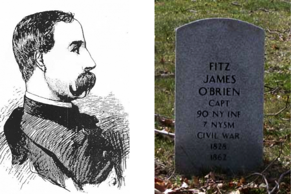 At the outbreak of the Civil War in 1861, O’Brien joined New York’s famed 7th Regiment in its first activation as a private, and marched off to protect Washington. Arriving in the nation’s capital, he observed, “We are here . . . we all feel somewhat as Mr. Caesar Augustus must have felt when he had crossed the Rubicon.” After his tour, he returned to New York City, where he unsuccessfully tried to organize the McClellan Rifles which was later consolidated into the 90th New York, in which he served as a captain. Joining the staff of Brigadier General Frederick W. Lander in early 1862, he received special and honorable mention for his gallantry at the Battle of Bloomery Gap, Virginia. After improper treatment of a shoulder wound that he had suffered in a skirmish on February 16, 1862, he died of tetanus in Baltimore, Maryland, on April 6, 1862. Before he died, he appointed literary executors stating, “…after I’m dead I may turn out a bigger man than when living.” The Confederate sword that he kept as a trophy of the skirmish at Bloomery Gap was borne on his coffin. After his death, several unsuccessful attempts were made to revive interest in the work of this “neglected genius.” H. L. Mencken would remember him as the only significant artist to die in the Civil War.