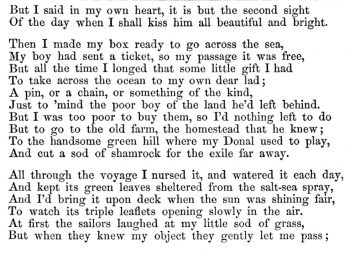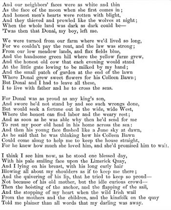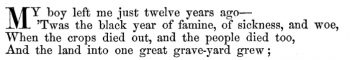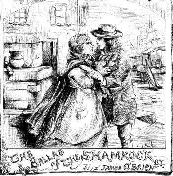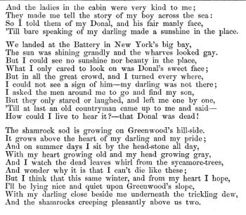 O’Brien first came to Washington, D.C., then settled in New York City where he frequented Pfaff’s cellar, a Bohemian establishment that attracted the writers of the day, including Walt Whitman. O’Brien was described as of medium height with wavy brown hair, blue eyes, small chin, heavy “cavalry” moustache and a broken nose, which was obtained in a fight. He contributed poems and short stories to New York City newspapers, Vanity Fair and the Atlantic Monthly, was a regular contributor to Harper’s magazine, and became a leading figure in the city’s Bohemian circles. One of his poem’s, The Ballad of the Shamrock, which tells of Irish immigration after the Great Famine, and notes burial of the speaker’s son at Green-Wood, is printed below. The article about his death in The New York Times notes that he was a frequent contributor to that newspaper and was a prolific writer known for charming fancy and exquisite prose. He wrote several plays including A Gentleman from Ireland, which first ran in 1854 and continued in successful revivals until 1895. In 1854, his play, The Sisters, enjoyed a run in New York City. O’Brien also wrote supernatural and science fiction tales. He lived lavishly in spite of his limited writer’s income and was known to be a brawler. Known to befriend those he fought with, it was said that he “never cared for anyone with whom he did not quarrel.”