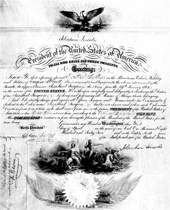 OLCOTT, EUGENE SANDS (1841-1864). Assistant surgeon, United States Navy. Olcott’s place of birth is unclear; one document says Brooklyn but the 1860 census says Kentucky. As per the 1860 census, Eugene was a student of medicine living with his uncle, Cornelius Olcott (see), in Williamsburg, Brooklyn. Olcott graduated from the University Medical College in 1862. He joined the United States Navy on January 24, 1862, was commissioned as an assistant surgeon, and appointed by President Abraham Lincoln (see below), on April 1, and served on the steam gunboat Cimarron. The Cimarron was launched from Bordentown, New Jersey, on March 16, 1862, and saw service in the James River Campaign. On January 21, 1863, he married Adelaide Johnson in Brooklyn. According to his widow’s pension application, he was debilitated by malaria while on duty in the James River in the summer of 1862. Subsequently, he suffered from pulmonary hemorrhages and then acute tuberculosis which necessitated his resignation. He resigned his commission, and his resignation was accepted by Gideon Welles, Secretary of the Navy, on January 6, 1864, at which time he was honorably discharged.