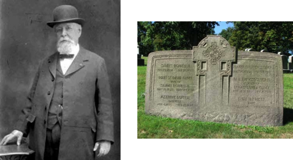 As per records of the Dutch Reformed Church, Osler married Emma Rusher, who is interred with him, on January 14, 1864, at the Washington Square Church in Manhattan. When he applied for a passport on April 19, 1870, he described himself as 5′ 10″ tall with brown eyes, black hair, a high forehead, prominent nose, florid complexion, round chin, and long, oval face. After traveling to England, he left Liverpool on the Marathon and arrived in New York City on May 16, 1870. The 1881 census of Ontario, Canada, reports that Osler, a Lutheran, was living in Toronto with his wife and widowed sister, Abigail Fackler, and was working as an organ builder; a John Fackler, most likely Abigail’s son, was an organ builder in New York City. The 1891 Canadian census reports that Osler was living in St. Paul’s Ward with his sister and brother; all three were widowed. At that time, George Osler was still working as an organ builder. Osler’s death certificate, filed in Oxford, Canada, notes that he was a Baptist and suffered from heart disease. His death in Woodstock, Canada, a town that had an organ factory during the time Osler lived there, and his veteran status are inscribed on his tombstone. His widow, his second wife, applied for a pension in 1909, application 933,458, but there is no evidence that it was certified. Section 202, lot 27952, grave 4.