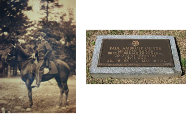 OLIVER, PAUL AMBROSE (1831-1912). Medal of Honor recipient; brigadier general by brevet; captain, 5th New York Veterans Infantry, Companies D and E; first lieutenant and acting aide-de-camp, 12th New York Infantry, Company E. Born at sea aboard an American flagship, the Louisiana, in the English Channel, he was a shipping merchant before the Civil War in New York City and New Orleans. In 1856, he organized the Fort Hamilton Relief Society in Brooklyn to prevent the spread of yellow fever there.
