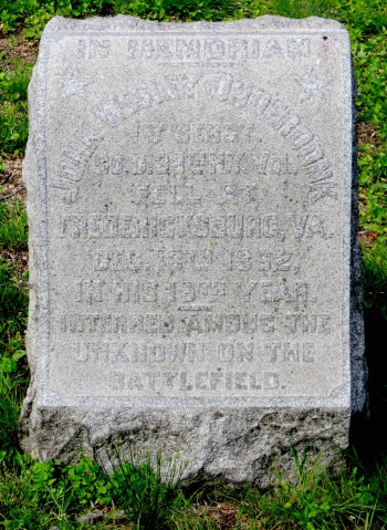 ONDERDONK, JOHN WESLEY (1843-1862). First sergeant, 38th New York Infantry, Company D. Onderdonk is not buried at Green-Wood; a cenotaph honoring his memory and his Civil War service is at Green-Wood. He was born in Rockland, New York. As per the census of 1850, he was living in New York City with his aunt, Abigail Onderdonk Myers and her husband, Bernard Myers, a baker and lifelong abolitionist; the Myer children also lived in the household. The 1855 New York State census reports that John and his sister, Frances, lived with the Myers’s family in New York City; at the time of the 1860 census, the Myers’s had moved to Brooklyn and John was an apprentice baker to his uncle. After enlisting as a private at New York City on September 21, 1861, Onderdonk mustered into Company D of the 38th New York two days later. He was promoted to sergeant on October 17, 1862, and to first sergeant on or about November 15, 1862. He died at the Battle of Fredericksburg, Virginia, on December 13, 1862. His cenotaph reads: