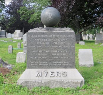His cenotaph is in the same lot as the remains of his aunt and uncle, Abigail O. and Bernard Myers (see photo below). Bernard Myers’s headstone inscription reads, “A father to the fatherless. His life was a benediction.” Abigail Onderdonk Myers’s inscription reads, “Gentle mother. She scattered love as stars do light.” Section 186, lot 29608.