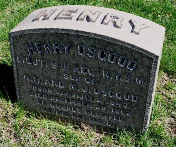 OSGOOD, HENRY (1843-1862). First lieutenant, 83rd New York Infantry, Company D. Osgood was born in Massachusetts. As per the census of 1860, he was living in New York City and working as a clerk. After enlisting as a private at New York City on May 27, 1861, he mustered into the 83rd (formed from the 9th Militia) the same day. He rose through the ranks to corporal, then to sergeant on November 4, 1861, to first sergeant on about June 15, 1862, and to first lieutenant (not mustered) on December 13, 1862, the same day that he was wounded in the abdomen at the Battle of Fredericksburg, Virginia. Osgood was hospitalized on December 23 at Lincoln Hospital in Washington, D.C., where he succumbed on December 29; other records give the date of his death as December 28 or December 30. Osgood’s name was listed on the Bodies in Transit List on January 4, 1863. He was removed from the muster rolls on January 15, 1863; his muster roll incorrectly reports that date as his date of death. He was interred at Green-Wood on January 5, 1863. Section 124, lot 14098.