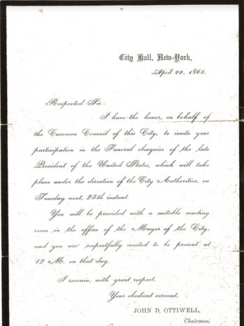 OTTIWELL, JOHN D. (1827-1900). Lieutenant colonel, 84th Regiment, New York State National Guard; captain, 12th Regiment, New York State Militia, Company D. Ottiwell was born in New York City. The 1855 New York State census reports that he lived in New York City with his wife and four daughters and worked as a tinsmith; on the 1860 census, he was listed as a master metal roofer whose personal estate was valued at $5,000. Active in Republican Party politics, he served on New York City’s Common Council in 1861 and 1862, and in total, held that position for five years; his obituaries in the New York Herald and the New York Daily Tribune, which confirm his Civil War service, note that he was the only Republican elected to that body in 1862. Ottiwell enlisted at New York City as a captain on April 19, 1861, was commissioned into Company D of the 12th New York State Militia, also known as the Tompkins Blues, on May 2, and mustered out at New York City with his company on August 5. As per his obituary in the New York Herald, Ottiwell was elected lieutenant colonel of the 84th Regiment in 1862. His obituary in the New York Daily Tribune reports that the Common Council sent him to the front after the Battle of Gettysburg, Pennsylvania, to look after the interests of New York State troops. Subsequently, Ottiwell served for 100 days in the 84th Regiment’s National Guard in 1864. In 1865, he was chairman of the special committee for President Abraham Lincoln’s funeral procession and obsequies in New York City on April 25, 1865; he signed the formal invitation to that event for guests gathered at noon in the Mayor’s meeting room at City Hall (see below). Ottiwell’s publication, Obsequies of Abraham Lincoln, published in 1866, under the auspices of the New York Common Council, detailed the observance. The 1867 New York City Directory lists him in the furnace business and also as an assessor (one who determines the value of real estate). Ottiwell was a delegate to the Republican Convention in Chicago in 1868 that nominated Ulysses S. Grant for president. In addition, he was a member of Hook and Ladder #9 of the old Volunteer Firemen in New York City.