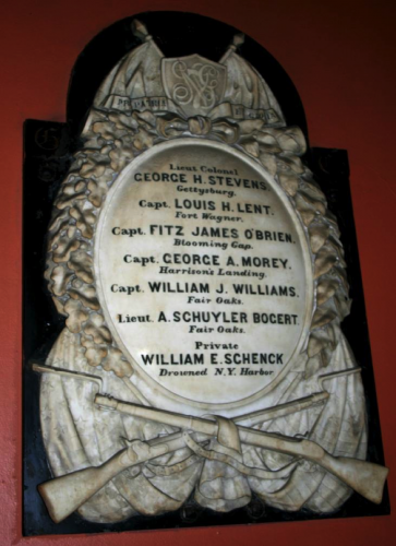 ODDIE, JOHN VAN SCHAICK (1845-1902). Private, 7th Regiment, New York State National Guard, Company H. Oddie, a native of New York City, was born at the Van Schaick mansion at Fifth Avenue and 14th Street. He was the son of William B. Oddie, a landscape artist; his brother, Walter Mason Oddie, was also a landscape painter. The 1855 New York State census reports that Oddie lived with his maternal grandparents in New York City; his mother died in Albany, New York, in 1850. During the Civil War, John V. S. Oddie served for 30 days in 1863 with the 7th Regiment. At age 22, he married Helen Freeman, the daughter of prominent New Yorkers at the Church of the Incarnation in New York City. The New York City Directory for 1867 reports that he was a broker at 31 Broadway. At the time of the census of 1880, he was living in Mamaroneck, New York, with his wife and children and was working as a broker. As per his obituary in the New York Herald, he was broker on Wall Street and for twenty years was a member of the New York Stock Exchange, during which time he made and lost two fortunes.