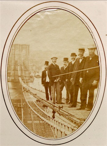William Paine, second from right, with Brooklyn Bridge workers, on the bridge as it was under construction, circa 1880.