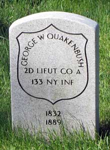 QUACKENBUSH, GEORGE W. (1832-1889). Second lieutenant, 133rd New York Infantry, Company A. Born in New York City, he enlisted there as a second lieutenant on August 12, 1862. On September 24, he was commissioned into the 133rd New York and was discharged on December 2, 1862. After the War, he joined the police force, and then the Fire Department, where he rose to foreman. Quackenbush is listed as a fireman in the 1877 New York City Directory; at that time, he lived at 162 Franklin Street in Manhattan. He was an active member of the G.A.R.’s Veteran Post #436. His last residence 644 Ninth Avenue in Manhattan. Quackenbush’s death was caused by valvular disease of the heart. Section 6, lot 20118, grave 572.