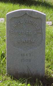 QUIGLEY, THOMAS (1835-1869). Private, 88th New York Infantry, Company E. A native of Ireland, he enlisted at New York City as a private on May 5, 1864, mustered into the 88th New York the same day, and deserted at an unknown place after a medical furlough expired on February 5, 1865. His last residence was 62 West Washington Place in Manhattan. His death was caused by phthisis. Section 127, Lot 8259, grave 47.