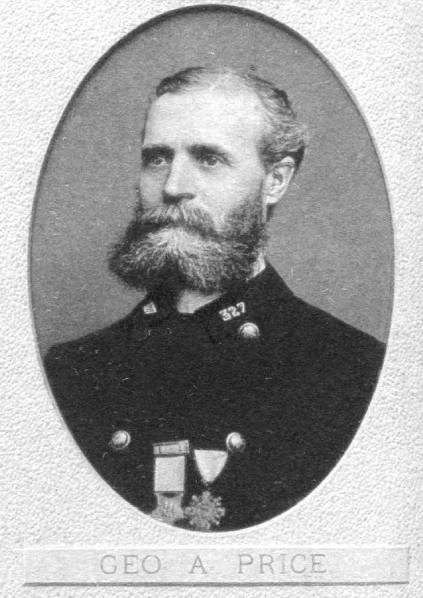 [searchform cats=”19″]PRICE, GEORGE ALLAN (1839-1924). Sergeant major, 9th Illinois Cavalry, Company M; private, 7th Regiment, New York State Militia, Company E. Price was born in Vestal, New York; his ancestors were among the first English settlers in Binghamton, New York, then called Point Chenango, and inhabited by the Oneida and Tuscarora Indians. After spending his early years in Broome County, New York, his family moved to New York City when he was twelve. A hatter by trade, he was 5′ 11″ tall with a light complexion, fair hair and blue eyes. As per his obituary in the Brooklyn Standard Union, which confirmed his Civil War service, he met Abraham Lincoln on November 6, 1860, when Lincoln was giving a speech at Cooper Union in New York City. Price and a friend climbed into the balcony to shake Lincoln’s hand after the address.