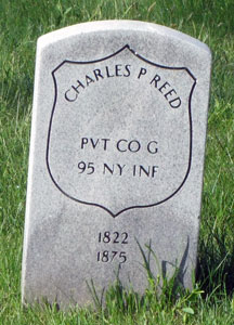 REED, CHARLES P. (or G.) (1822-1875). Private, 95th New York Infantry, Company G. A native New Yorker, he enlisted there as a 40-year-old private on February 27, 1862, mustered into the 95th that same day, and was discharged for disability on February 20, 1863. His last address was 602 West 49th Street, New York City. His death was attributed to “cares of vertebra.” Section 15, lot 17263, grave 253.
