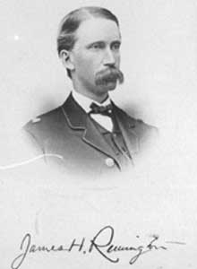 REMINGTON, JAMES H. (1839-1899). Major by brevet; captain, 7th Rhode Island Infantry, Company H; United States Veteran Reserve Corps. Remington’s ancestors purchased their family homestead in Warwick, Rhode Island, from the Narragansett Indians. James Remington’s father, Benjamin Remington, left his seat in the State legislature to crush the Dorr Rebellion (1841-1842), an uprising that sought to extend the vote to non-landowners, and was a prominent Whig who later was one of the founders of the Republican Party.